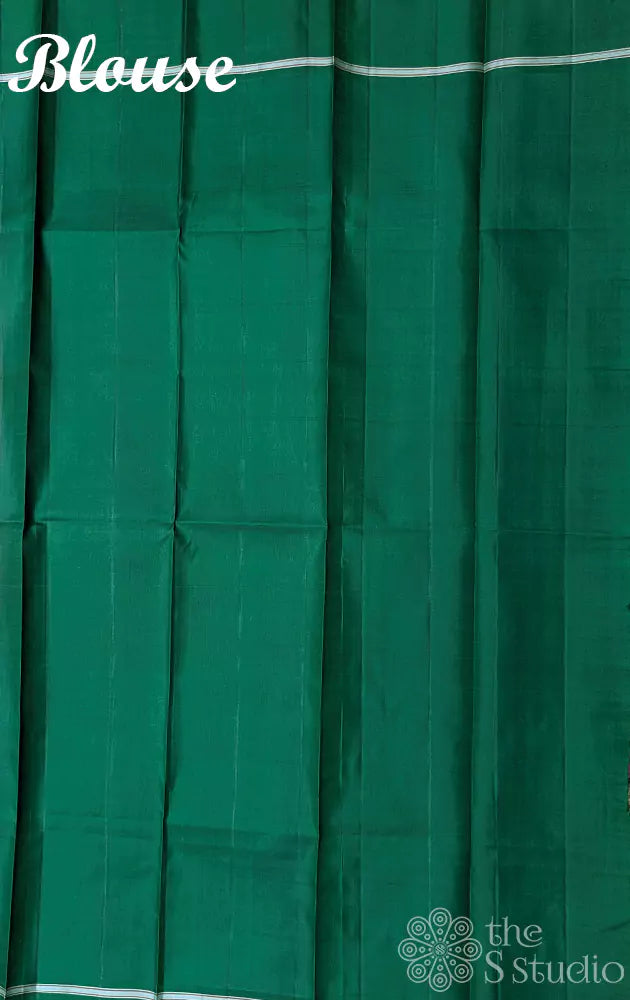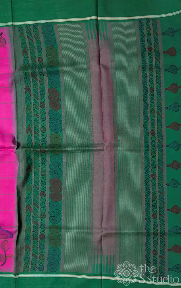 Rani pink kanchi silk saree with hand painted kalamkari along the border
