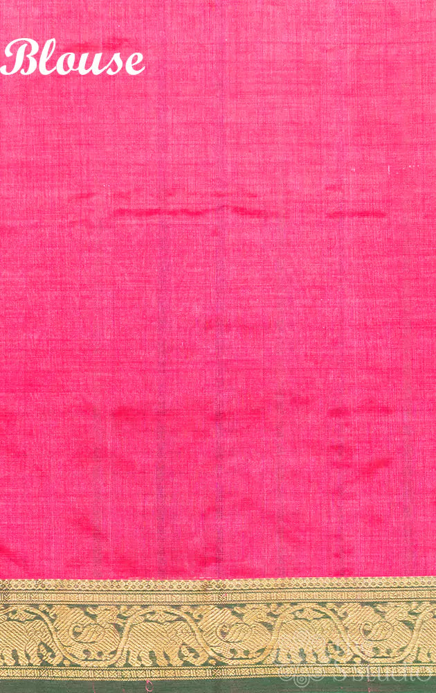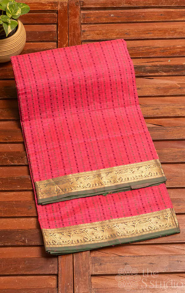 This rose checked silk cotton saree is adorned with a zari border, featuring intricate elephant and peacock motifs. The pallu is beautifully woven with traditional peacock and elephant motifs, adding a classic touch to the saree.