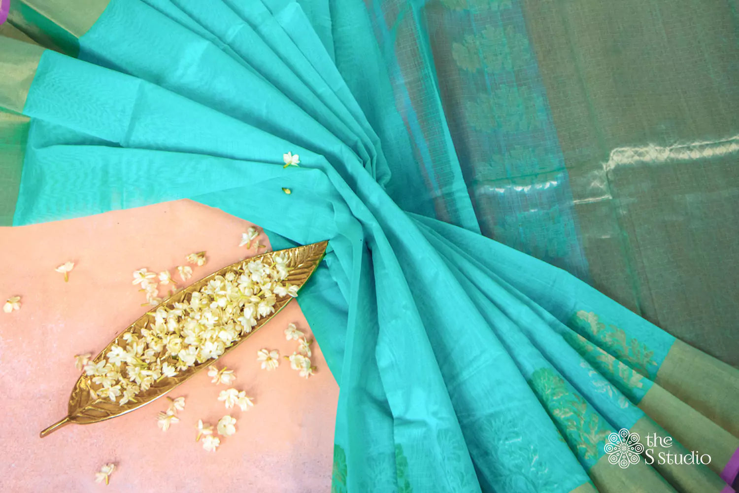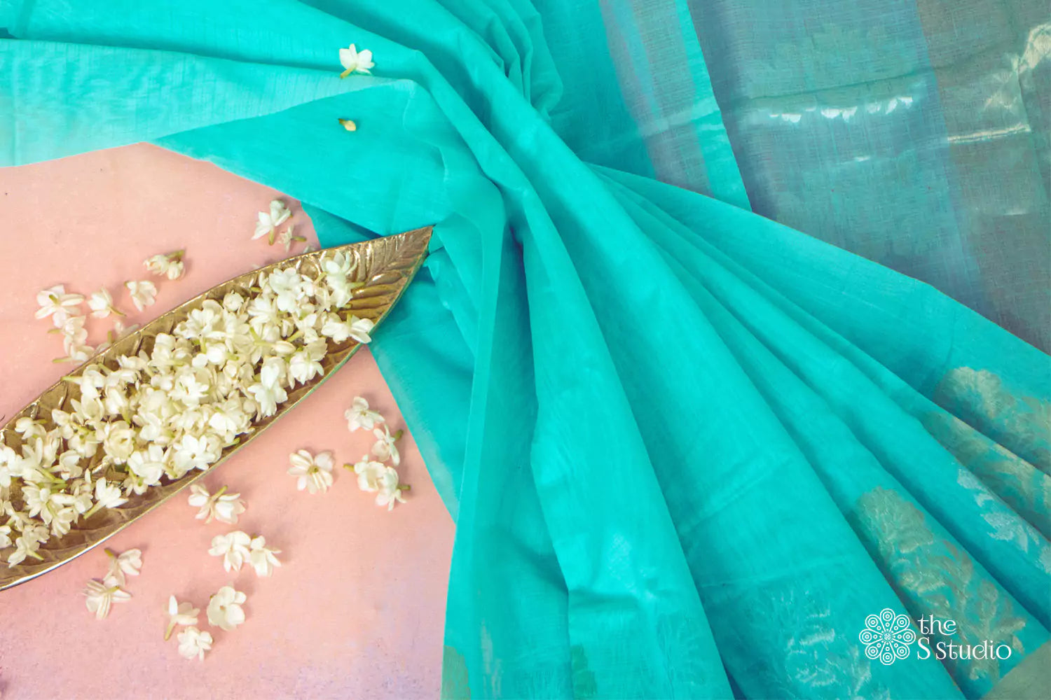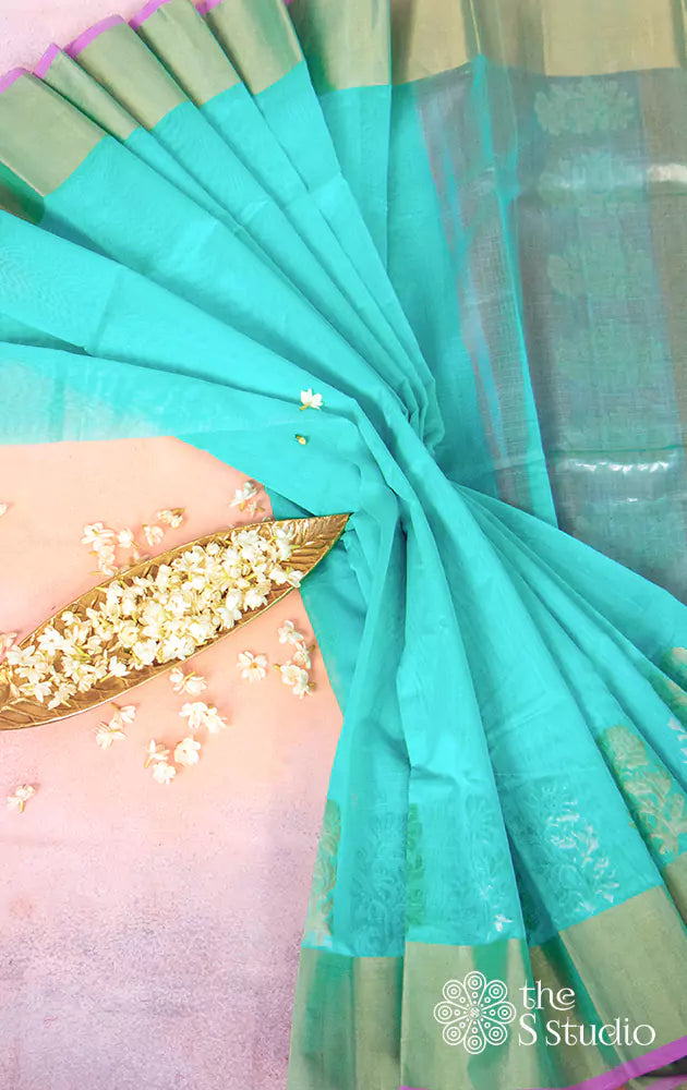 Sea Green Silk Cotton Saree with a pretty Zari Woven Border. The blouse is in contrasting Pink colour hue.