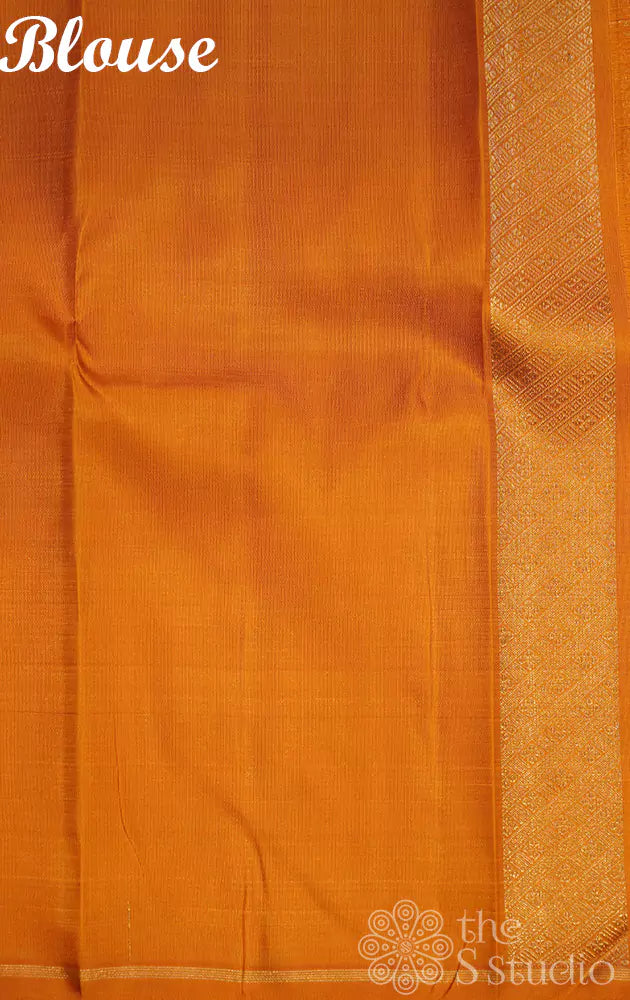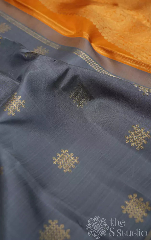 Slate grey kanchi silk saree with traditional kolam buttas woven in pure zari. The contrast mustard pallu adds to the richness of this handloom kanchi silk saree.