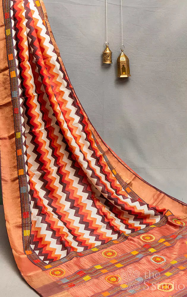 A white, rust and brown tussar silk saree featuring zigzag patterns across the body. The border and pallu are decorated with beautiful kantha hand embroidery.