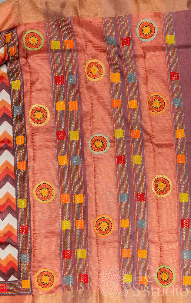 White and rust tussar silk saree with kantha hand embroidery