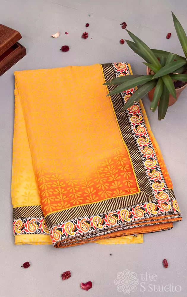 Yellow and Orange Organza Block Printed Saree with Blouse