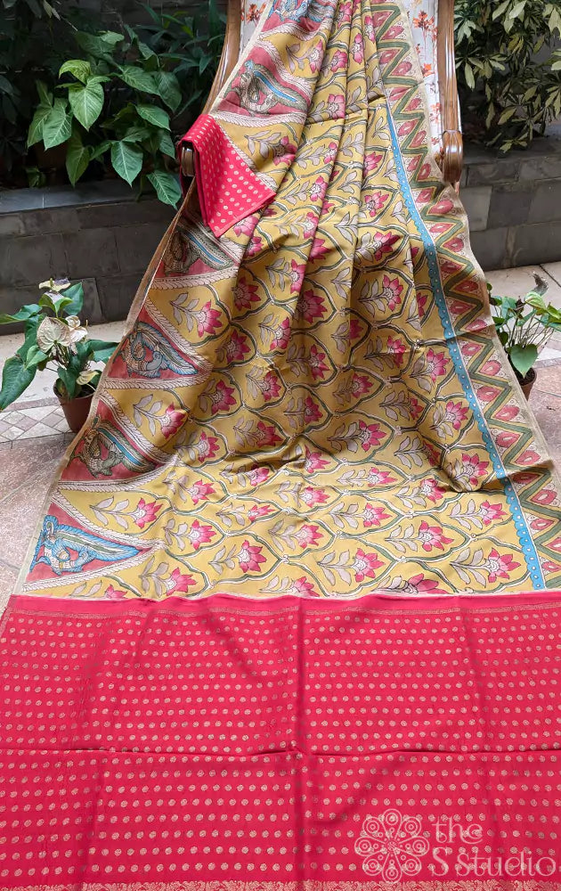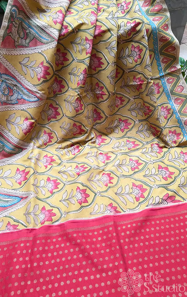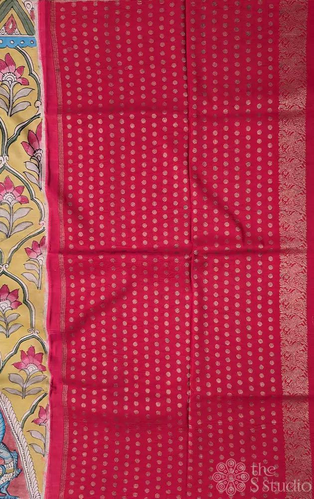 Yellow hand painted kanchi kalamkari saree with a contrast maroon pallu and butta blouse